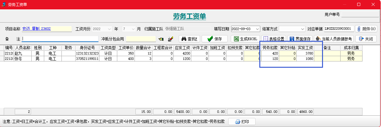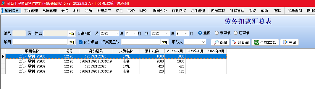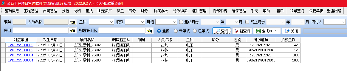 金石項目管理軟件增加勞務扣款單,可以按人填寫勞務工人扣款信息,并生成勞務工資表。