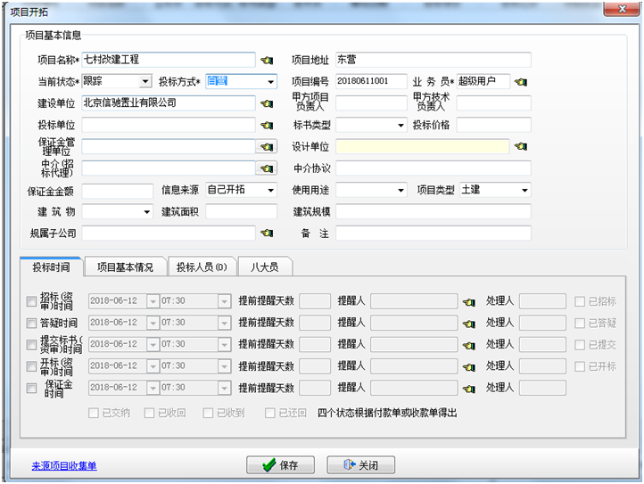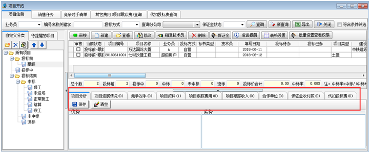2. 填寫項目開拓的相關信息記錄(項目分析、項目進展情況、競爭對手、項目資料、項目跟蹤費用、項目跟蹤收入、項目合作單位、保證金,代扣投標費等)。