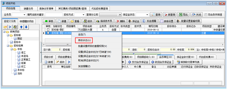 隨著投標的進度右鍵可以設置投標狀態
