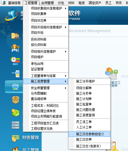 二、工程項目管理軟件施工日志自定義:菜單欄 “工程管理模塊”→“施工進度管理” →“施工日志參數自定義”