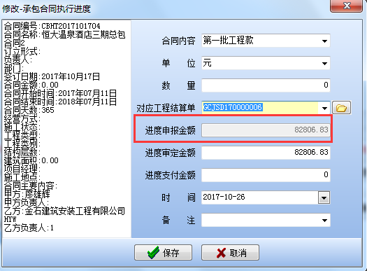 4.填寫“承包合同”執(zhí)行進(jìn)度,對應(yīng)工程結(jié)算清單,(下圖)“進(jìn)度申報(bào)金額”就是在工程結(jié)算單中填寫的暫估收款金額,“進(jìn)度審定金額”就是報(bào)給甲方審定后的最終收入金額