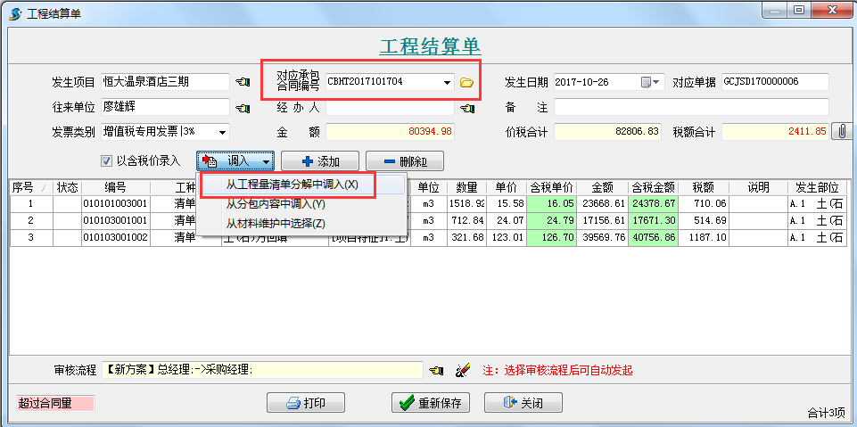 3.做工程結(jié)算單(暫估收入)對應(yīng)承包合同編號,調(diào)入上圖中做好的“部位分解”中的清單內(nèi)容