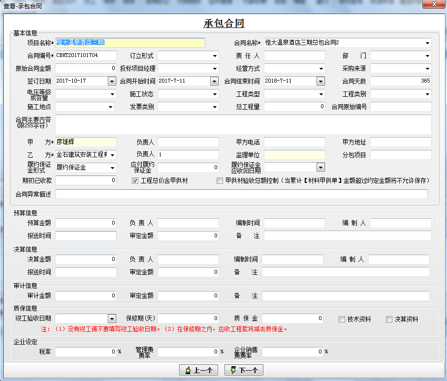 1.【工程管理】→【承包合同】 新建承包合同,選擇甲方、乙方等主要的合同內(nèi)容信息