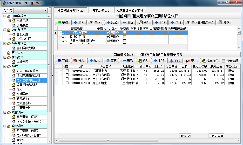 2.合同建立完成后,對項(xiàng)目進(jìn)行部位的分解(支持導(dǎo)入廣聯(lián)達(dá)、智多星等主要清單軟件做出的工程量清單直接導(dǎo)入到軟件內(nèi),也可以根據(jù)軟件的格式編輯EXCEL表格進(jìn)行導(dǎo)入)