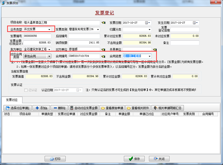 發(fā)票登記有多處需要注意,“業(yè)務(wù)類型”為開出發(fā)票(銷項(xiàng)稅),對應(yīng)“承包合同”、“合同編號”和“合同進(jìn)度”。