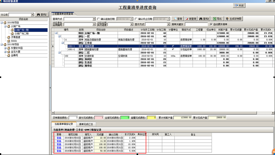 工程項目管理系統(tǒng)中進行項目進度查詢時,系統(tǒng)會根據(jù)項目部分以及工程量清單匯總項目進度。如圖: