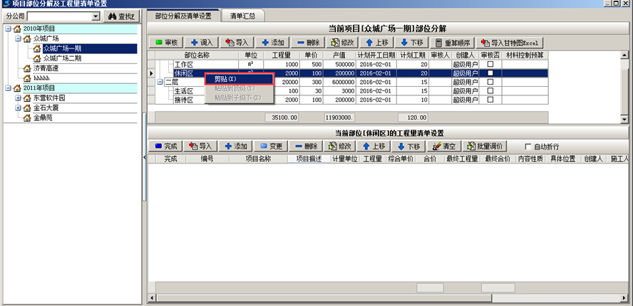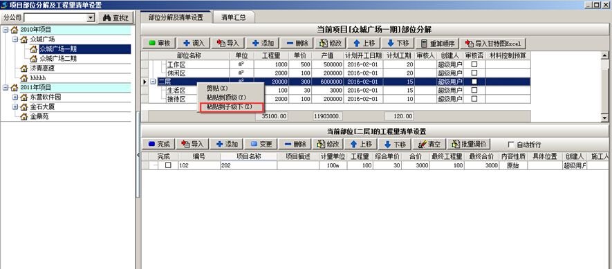 工程項目管理系統(tǒng)中已維護好的項目部位可進行剪切粘貼的操作。“剪切”時選中要變動的部位,點擊鼠標(biāo)右鍵選擇“剪切”,“粘貼”時選中項目部位,點擊鼠標(biāo)右鍵,選擇“粘貼到頂級下”或“粘貼到子級下”,如圖: