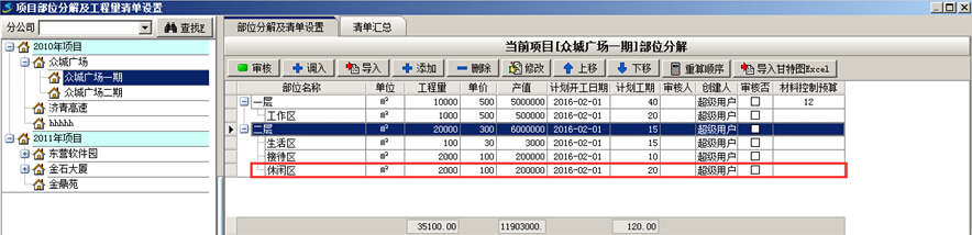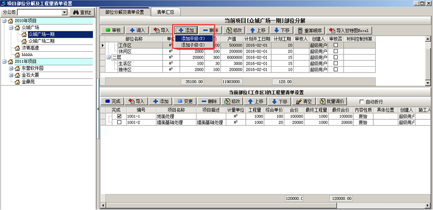 在《金石工程項目管理系統(tǒng)》中,進行項目部位分解時,可按照層次或級別進行分解,即添加“平級”或“子級”。