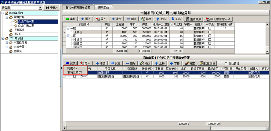 (2)由于某種原因工程不再繼續(xù)進行,但是完成的工作量小于設(shè)置的工程量,此時需要在【部位分解工程量清單設(shè)置】中手動設(shè)置清單為“完成”狀態(tài)。如圖: