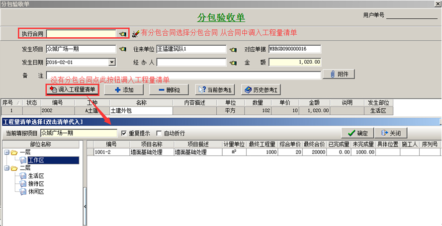 (2)分包驗收單中,如果簽訂了分包合同點[執(zhí)行合同],從合同內(nèi)容中選擇清單,否則點擊[調(diào)入工程量清單],把工程量清單調(diào)入分包驗收單中。如圖: