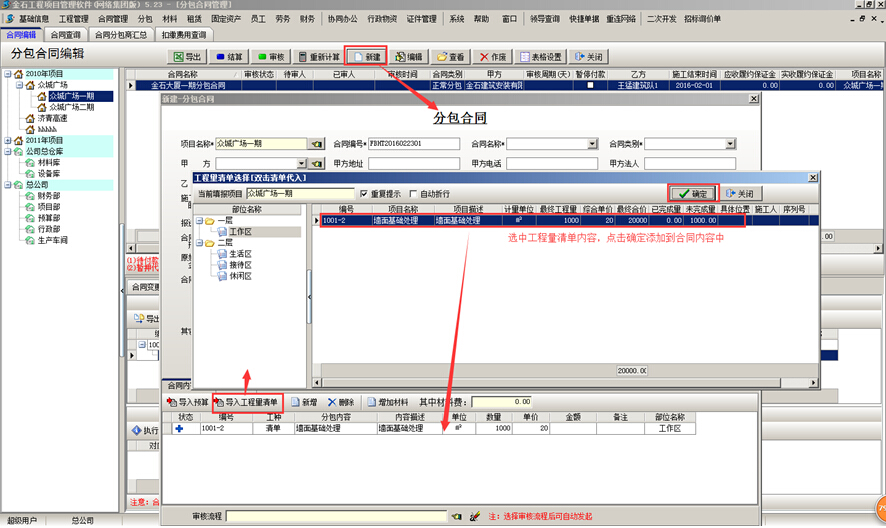 (1)選中對應(yīng)的分包合同點擊“新建”按鈕,把工程量清單導(dǎo)入合同中。如圖: