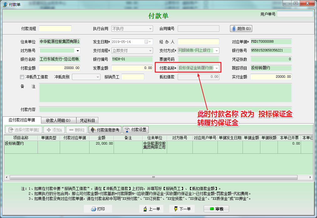 選擇結轉后,我們再去查看原投標保證金的付款單時,發現付款名稱變為:投標保證金轉履約保證金,如下圖所示,