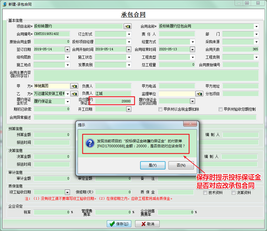 3、承包合同建立時,會發現應付履約保證金金額為投標保證金的金額,而且在保存時會有是否對應合同的提示,如下圖所示,