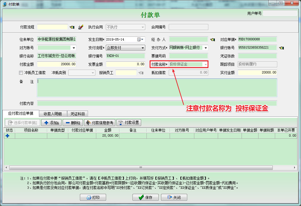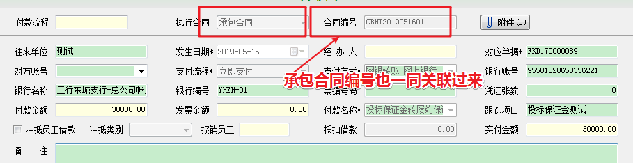選擇對應合同后,我們再去查看原投標保證金的付款單時,會發現,該付款單已經與新建的承包合同關聯起來。