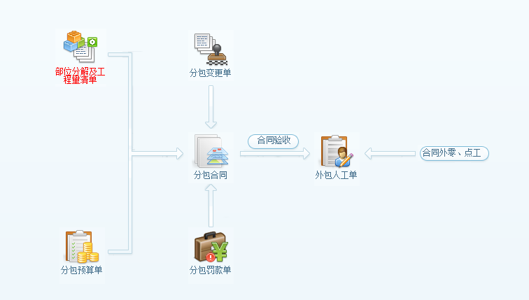 工程項目分包管理,可用于統(tǒng)計專業(yè)分包產生的成本及臨時雇用的零工成本。如軟件流程圖所示:分包成本是由外包人工單產成,其來源可分為兩部分,第一:來自分包合同中的合同驗收,第二:來自合同外零、點工驗收。