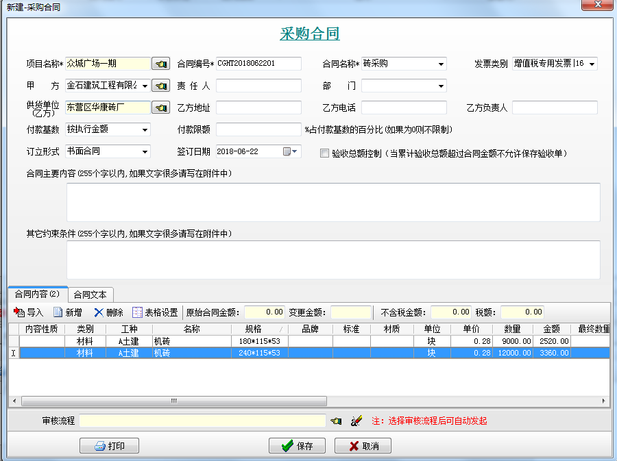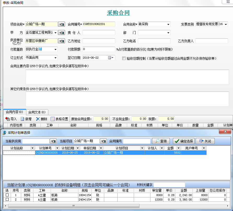 第二步,新建合同時(shí)可以從采購(gòu)計(jì)劃選擇合同內(nèi)容明細(xì)。