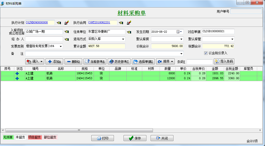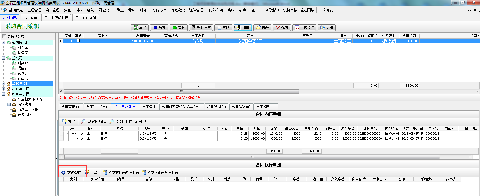第三步,材料到貨之后,可在采購(gòu)合同選擇到貨驗(yàn)收或者直接新建材料采購(gòu)單選擇執(zhí)行合同。