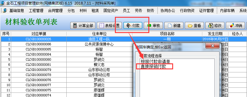在材料采購(gòu)單列表中找到需要報(bào)銷的單據(jù),選擇“直接報(bào)銷付款”