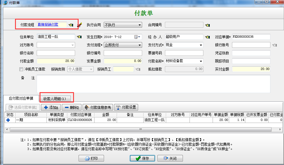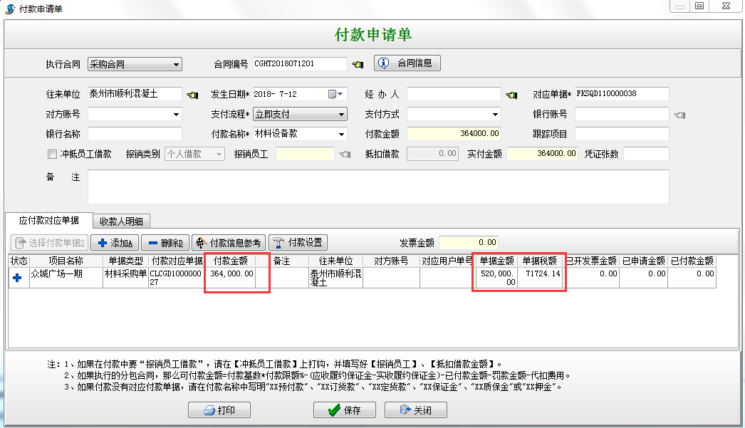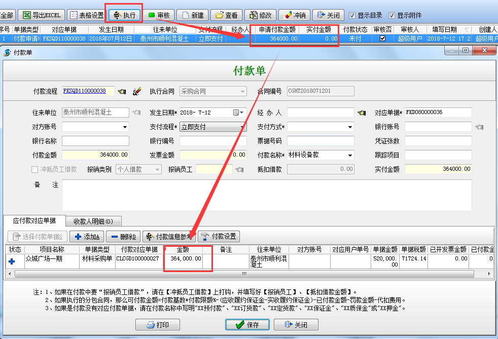 選擇“執(zhí)行付款”根據(jù)向?qū)Ш笙到y(tǒng)會(huì)自動(dòng)根據(jù)材料單據(jù)金額*付款比例,自動(dòng)得出待付的金額