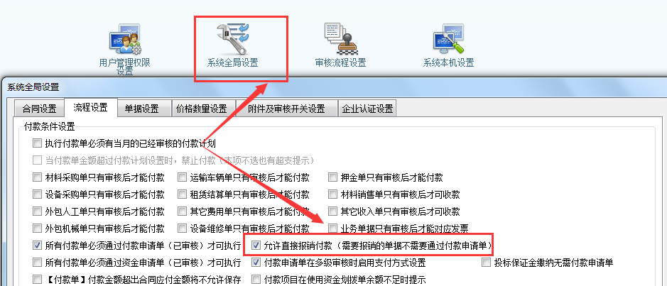 在“系統(tǒng)維護(hù)”→“系統(tǒng)全局設(shè)置” 開(kāi)啟“允許直接報(bào)銷付款”