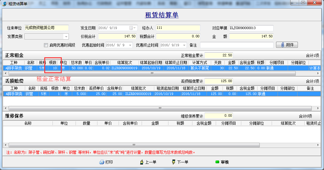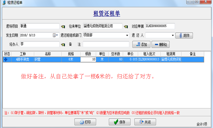 3.在還的時候發現其中有一根6米的損耗成5.5米了,把自己的1根6米還給對方,租金扔按10根6米算。(實際是把損耗后的5.5米與自己的6米做了對換,即:歸還給了淄博元成物資租賃公司6米,自己實際還剩下一根5.5米鋼管)