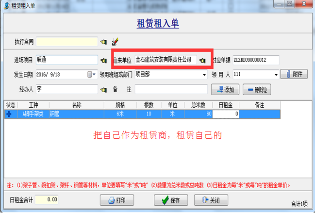 例二、工程項目管理軟件中自己沒有鋼管,直接賠錢給租賃商
