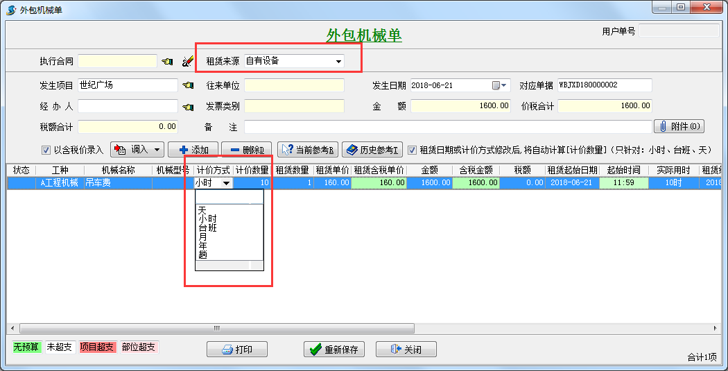 【租賃管理】-【外包機械單】中,選擇以自有設備外包,也可以實現計算設備成本,如下圖: