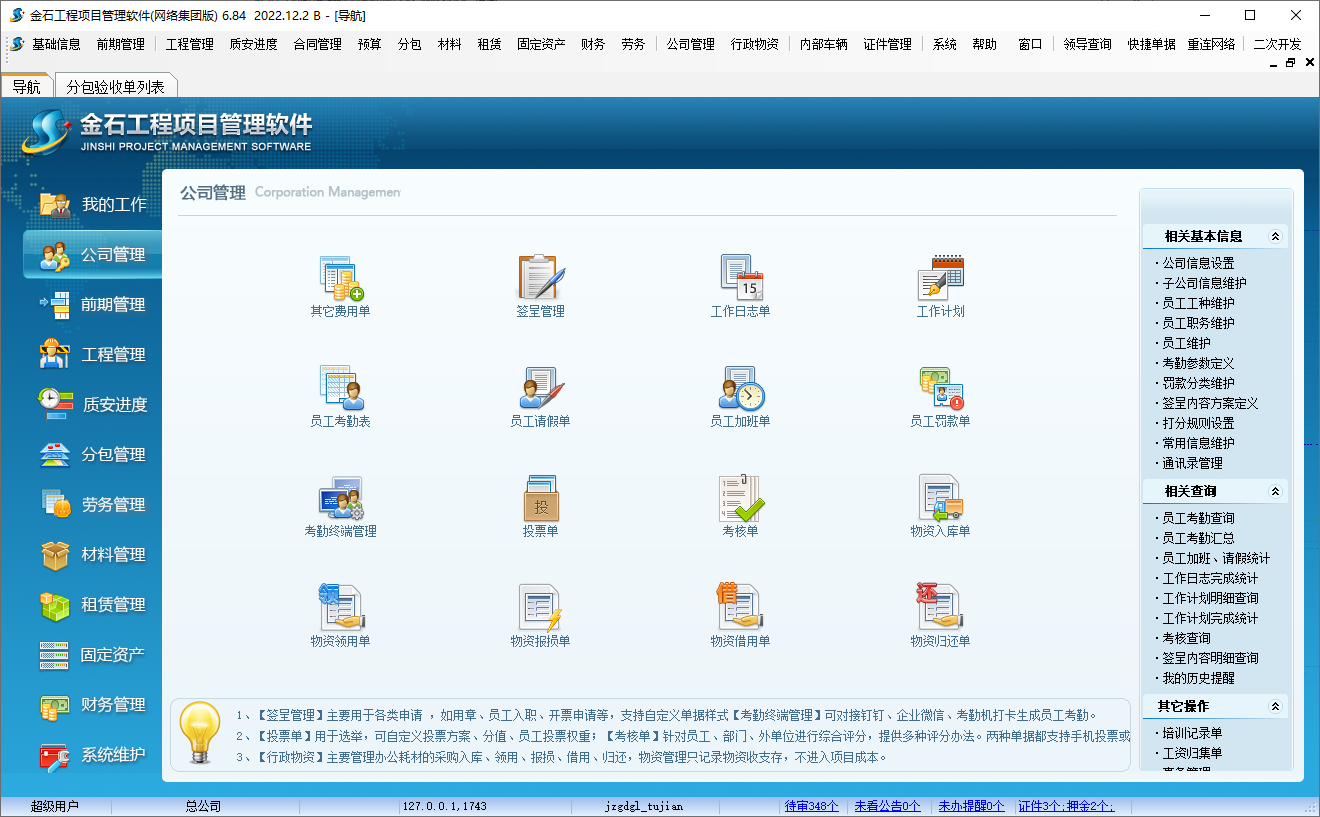 增加了公司管理,前期管理和勞務管理的導航模塊。公司管理模塊包括行政部門主要的管理內容,如員工維護、員工考勤單、員工請假單、員工加班單、員工罰款單等員工管理的內容;如物資入庫單、物資領用單、物資借用單、物資歸還單等行政物資的內容;還增加了投票單和考核單的內容。前期管理模塊主要包括項目收集單、項目開拓、投標資料庫、報價資料庫和投標人員業(yè)績查詢等內容。勞務管理模塊主要是把原菜單的內容添加進來,讓導航模塊內容更充實。