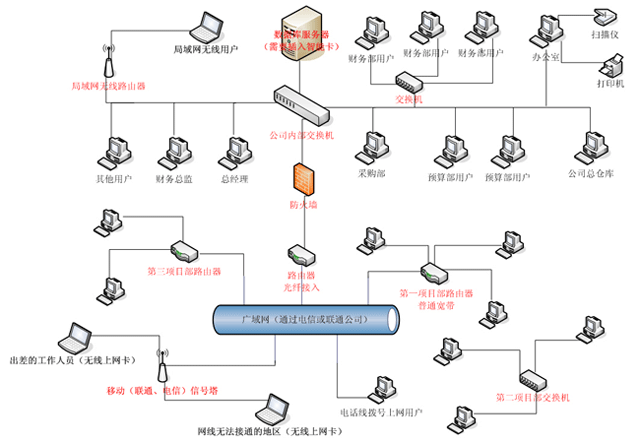 《金石建筑工地管理系統》在綜合了建筑企業在網絡辦公要求后,實結合了該公司的實際需求建立了如上圖所示的公司辦公平臺。在硬件上,使用最經濟、性價比較高、安全性很強的設備建立既能滿足公司現階段需求有能符合將來一段時間內的信息化需要的硬件設施,并為公司以后硬件及信息化發展預留充裕的空間及相關接口。在軟件上建立專門的對內和對外的信息通道,對內串聯公司各科室部門,對項目部進行有效監管,并為項目部提供高效的上報及反應通道,實現公司內部的信息高速互通;對外建立公司的信息發布平臺,及時的為公司相關外來的單位發布公司及項目信息。