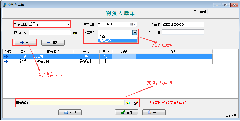 【物資入庫單】是用來登記發生的物資入庫的單據。