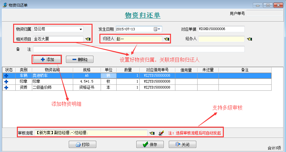 備注:在填寫物資歸還單時,必須對應借用單號,按照物資借用單單號歸還物資。