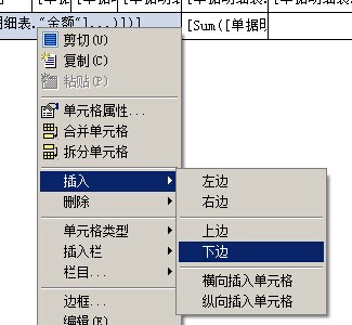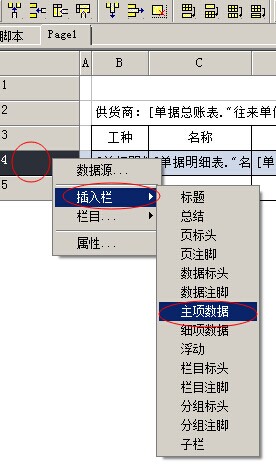 我們首先在左側第4行點擊鼠標右鍵,選擇插入欄(第一次使用,欄目中沒有,要選擇插入。第二次使用,在欄目中選擇),選擇【主項數據】。在彈出的窗口中選擇【單據明細表】。如下面兩張圖: