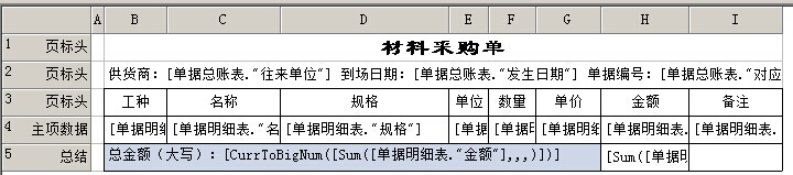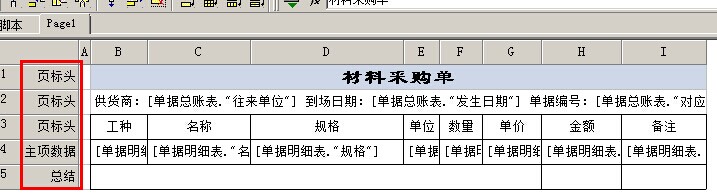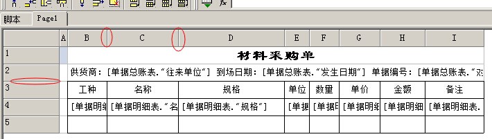 7. 把單據中需要打印的內容,放入表格中。例如:材料的工種,名稱、規格、單位、數量、單價、金額、備注等,如下圖,在第三行中我們輸入名稱,第三行中輸入對應的字段名稱。
