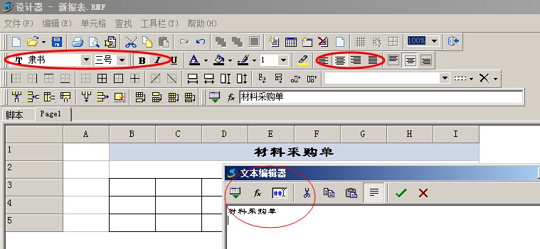 5. 雙擊第一行輸入,在彈出的文本框中,輸入打印標題的名稱例如材料采購單。然后選擇字體及大小。