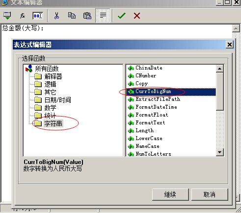 再來插入一個大寫,累計金額。同樣是選擇插入函數,選擇字符串中的,CurrtoBigNum, 點繼續按鈕,然后把之前得出的結果[Sum([單據明細表."金額"],,,)]復制到里面。