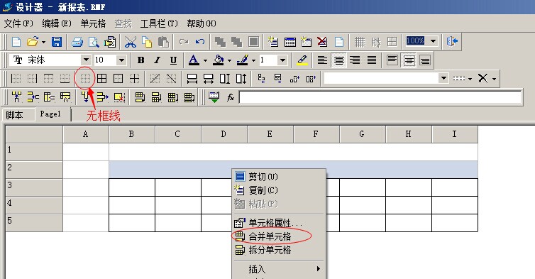 4. 首先我們選中A 列或第一行、第二行后,點擊工具欄的無框線按鈕,把第一行和A列的邊框隱藏掉。然后我們點擊鼠標右鍵,使用【合并單元格】合并第一行、第二行的單元格。