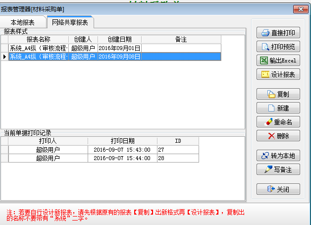 (1) 開啟【打印次數(shù)顯示】的單據(jù)報表設(shè)計只能由“超級用戶”來管理。(2) 在單據(jù)的【打印報表】界面下點(diǎn)擊【打印】后,無論是否打印成功,打印次數(shù)將自動加1。