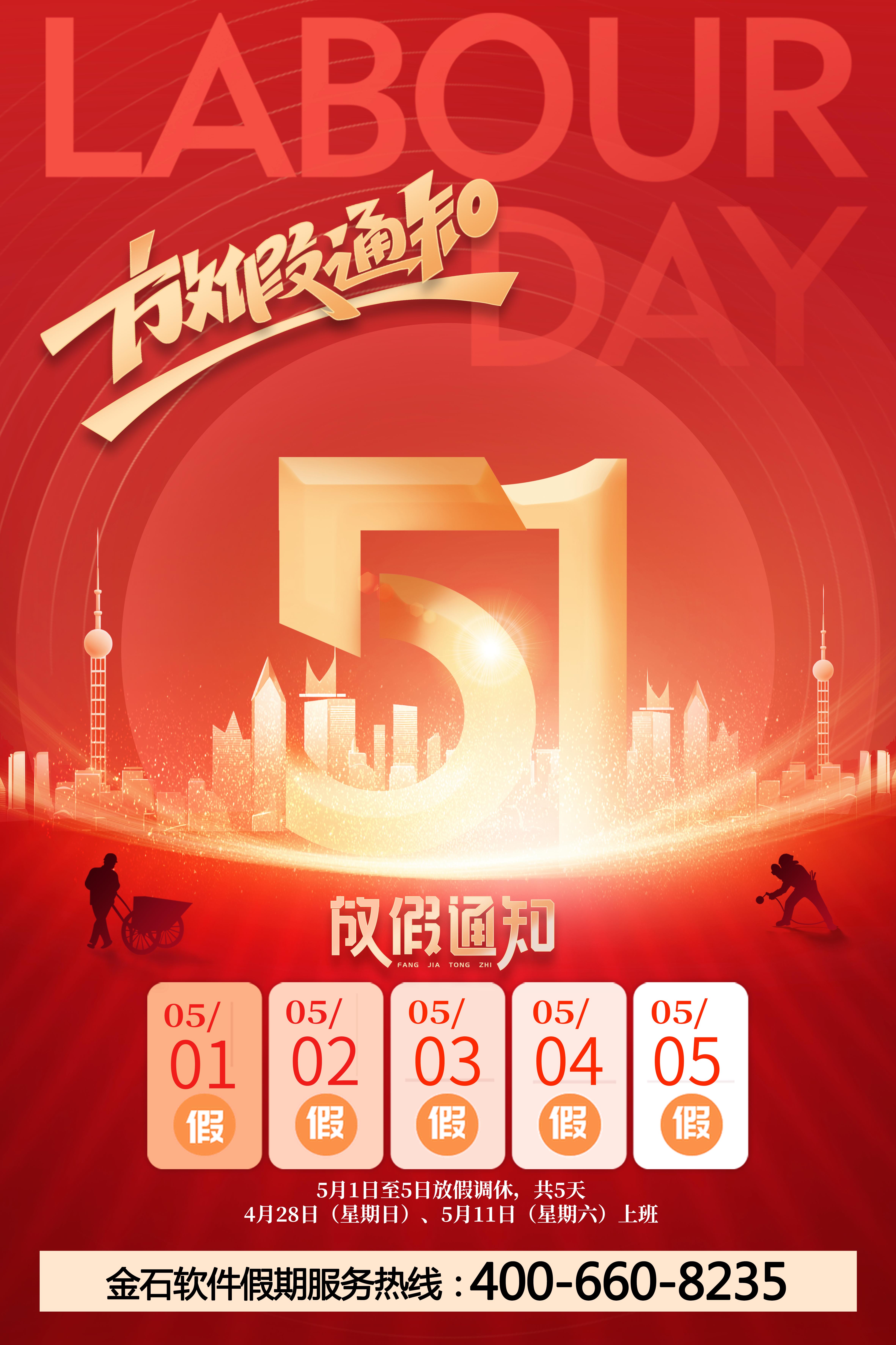 為響應國家放假辦相關號召,金石軟件定于2024.5.1-5.5日放假,假期400-660-8235正常接通,如有需要,歡迎致電。