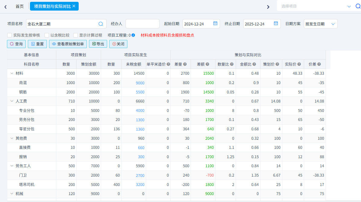 根據(jù)設(shè)置的合同人工費(fèi)、合同材料費(fèi)、合同機(jī)械費(fèi)、合同周轉(zhuǎn)材、合同專業(yè)分包、合同其他直接費(fèi)、合同間接費(fèi)、合同金額、預(yù)算人工費(fèi)、預(yù)算材料費(fèi)、預(yù)算機(jī)械費(fèi)、預(yù)算周轉(zhuǎn)材、預(yù)算專業(yè)分包、預(yù)算其他直接費(fèi)、預(yù)算間接費(fèi)、預(yù)算金額16項(xiàng)預(yù)算金額與實(shí)際發(fā)生金額進(jìn)行對(duì)比,實(shí)際發(fā)生金額計(jì)算規(guī)則可以根據(jù)查詢規(guī)則進(jìn)行設(shè)置。