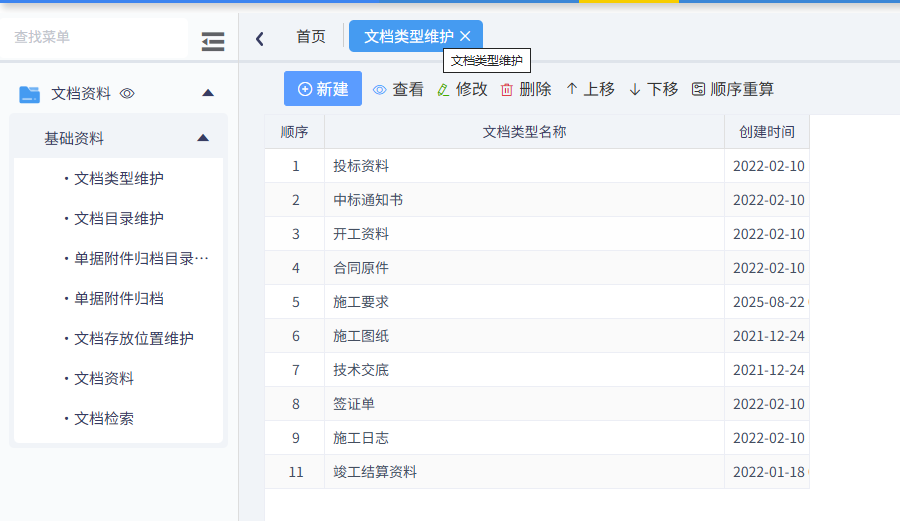 常用文檔資料的類型,比如投標資料、中標通知書、開工資料等,如下圖