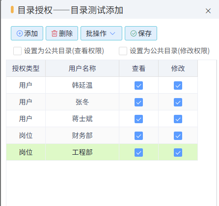 授權:用于授權當前目錄的權限,權限分為查看和修改,可以設置為公共目錄(查看權限),也可設置為公共目錄(修改權限)。如下圖所示,