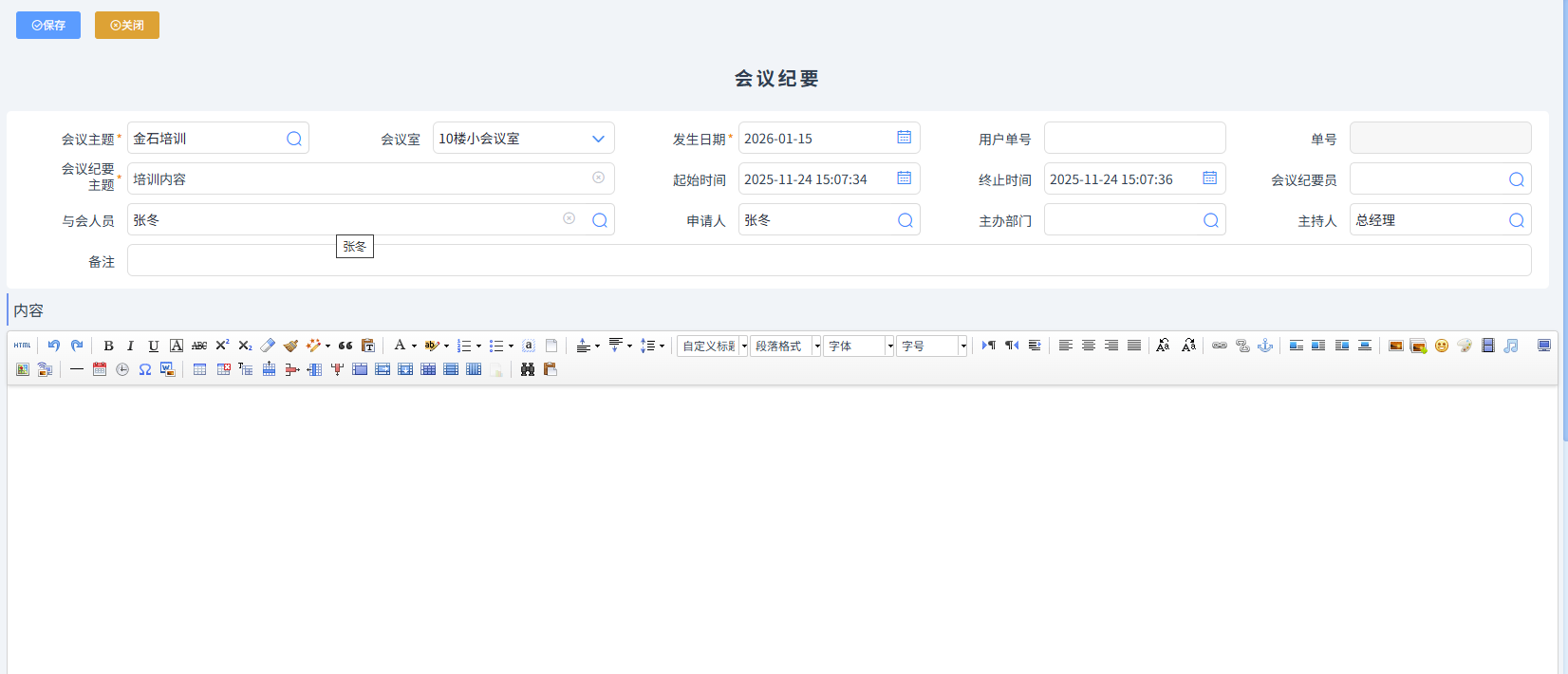會議紀要員根據(jù)會議內容,記錄會議紀要,整理完畢后,做會議紀要登記,如下圖所示,內容部分,可以復制黏貼整理好的內容,還可以添加圖片,調整字體、段落格式等,