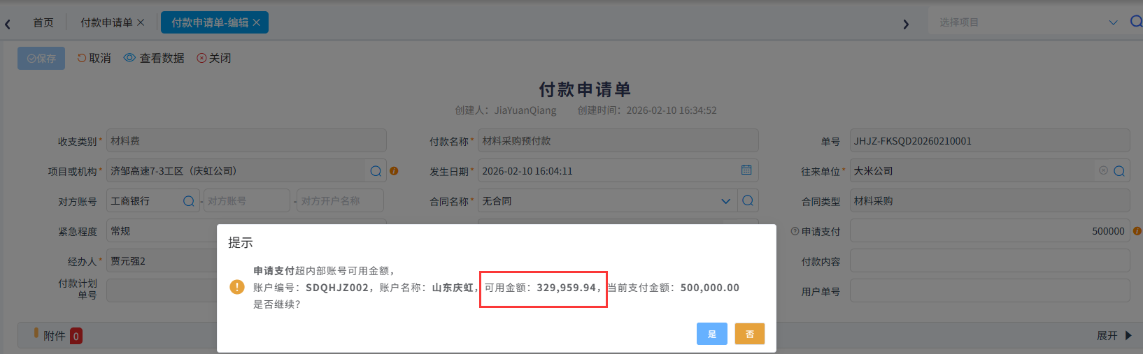 【付款申請單】超項目資金余額、內部賬戶金額預警提示,避免超項目的資金賬戶余額不足時,仍提交付款申請并完成支付,防止出現資金透支、違規(guī)墊付等問題,保障資金安全。