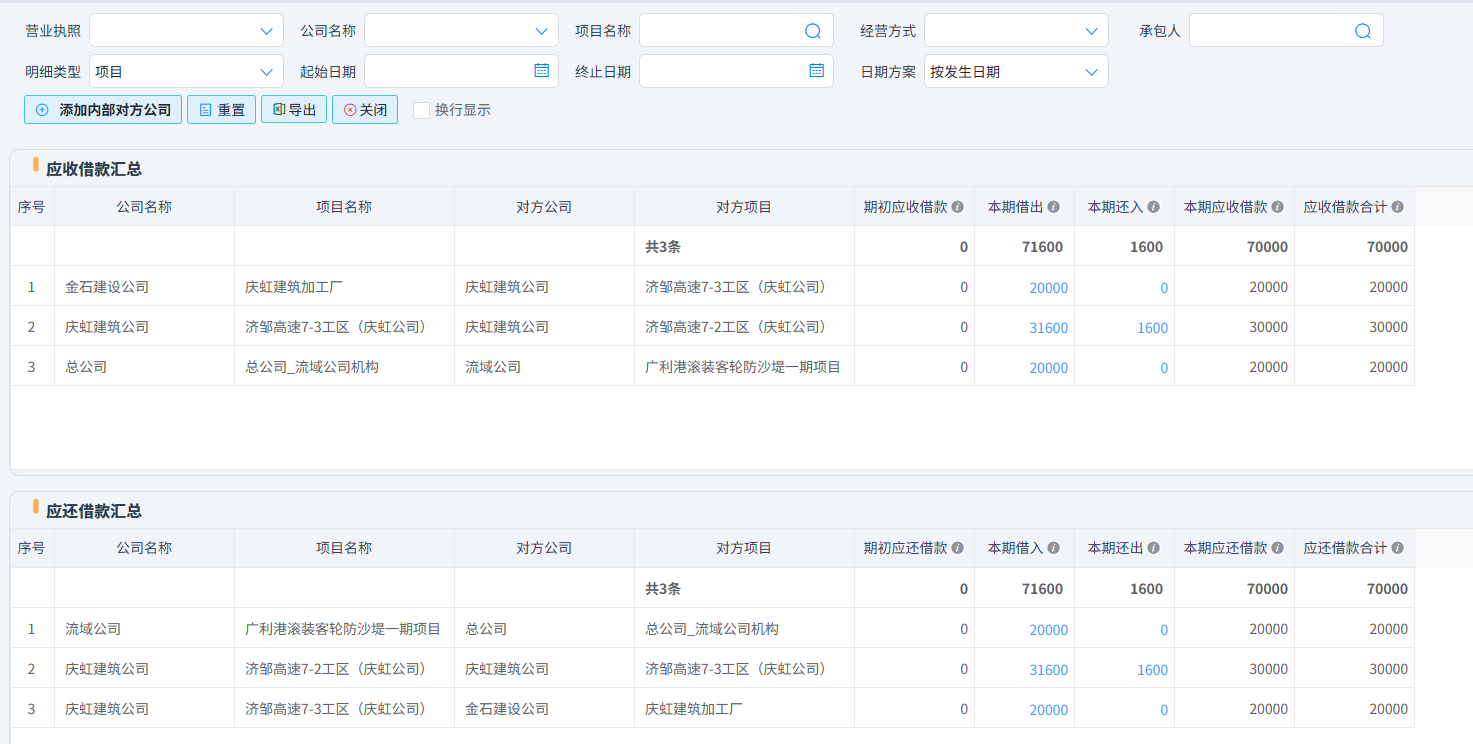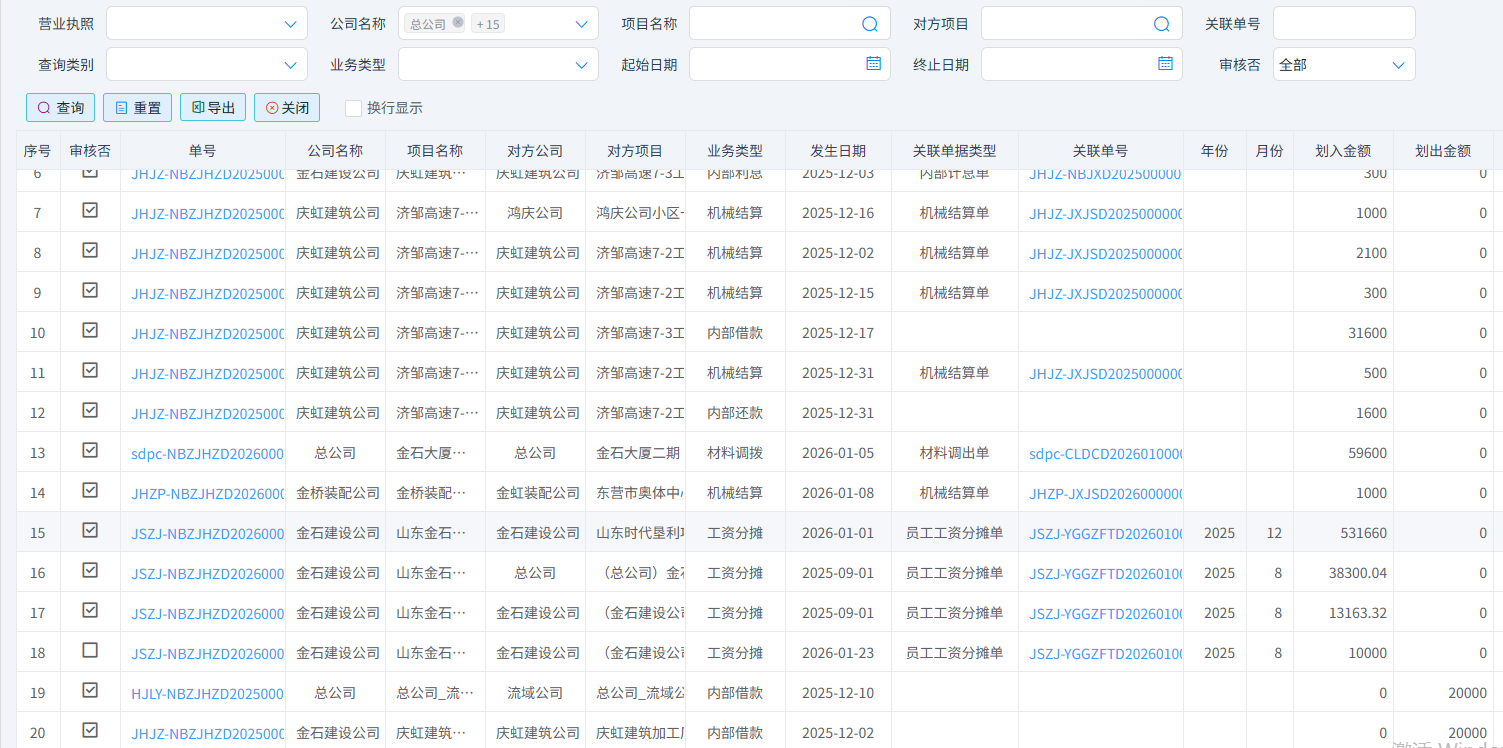 大部分內部業(yè)務是先有內部結算(如【機械結算單】、【周轉材結算單】、【費用分攤】、【材料調撥】、【工資分攤】、【項目補繳稅金】、【內部借款】、【內部還款】、【內部利息】)再以內部結算進行企業(yè)內部資金劃轉,每筆結算和劃轉必須是相同一個“營業(yè)執(zhí)照”內不同機構或項目之間的內部往來,可規(guī)范內部資金流轉,確保資金調撥有跡可循、審批合規(guī)便于財務部門統(tǒng)一核算、對賬和資金管控。