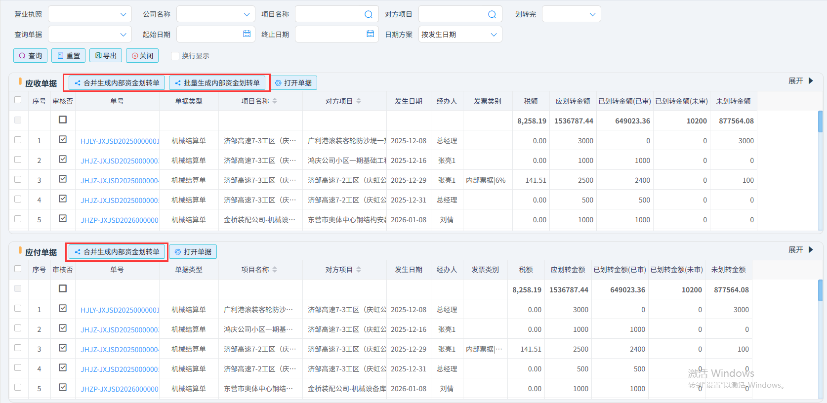 如:針對上圖的機械結算單進行資金劃轉