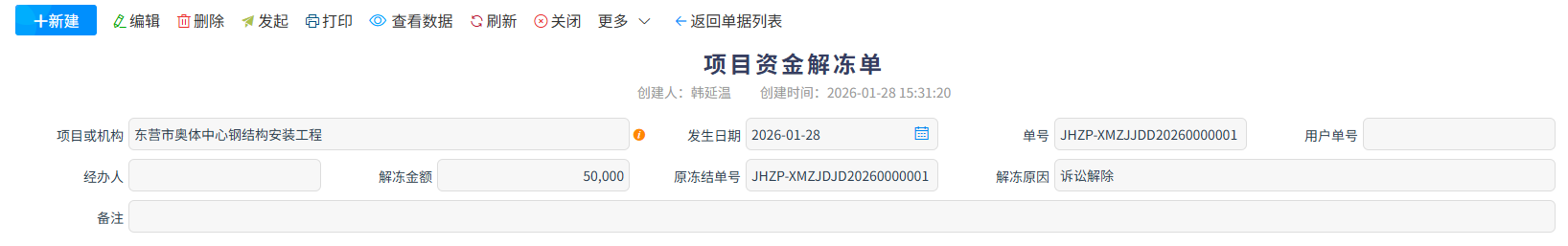 項目資金解凍單是配套【項目資金凍結單】的風控單據,用于對已凍結的項目資金發(fā)起解凍申請、完成審批流程并留存正式記錄,核心是按規(guī)解除資金的支取與流轉限制,讓凍結資金恢復正常使用狀態(tài)。