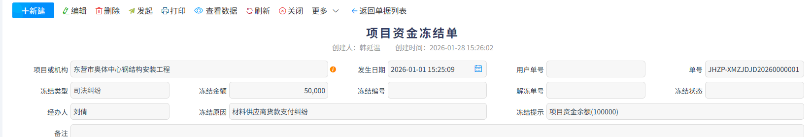當項目出現欠薪、糾紛、訴訟等風險,或需專項留存資金時,通過凍結單鎖定資金,防止挪用、轉移,保障資金安全與后續(xù)履約、糾紛解決或案件處理。