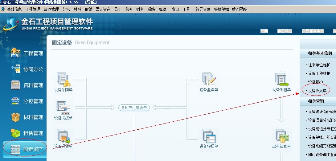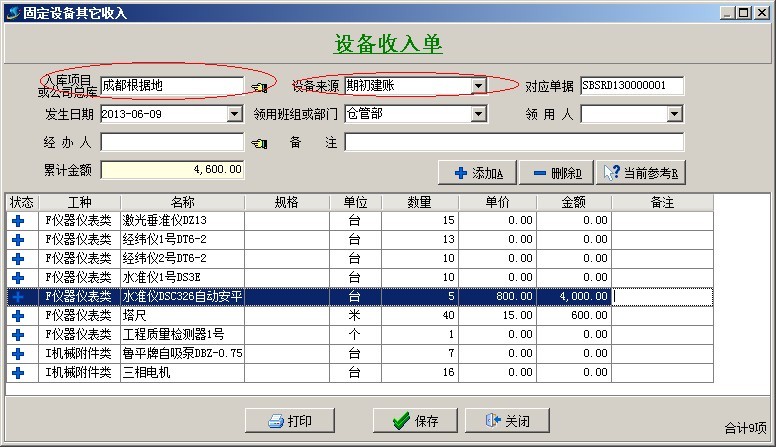 固定設備、材料庫存的實際數量應該通過業務單據來錄入。其中固定設備通過設備收入單來錄入期初數量。如下圖: