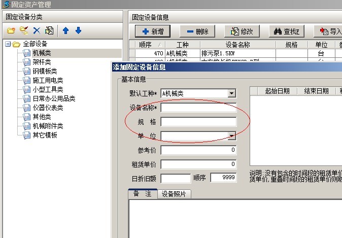 首先注意的是,不要把固定設備期初統計、材料庫存統計與基礎信息中設備維護、材料維護混淆。其中設備維護和材料維護記錄的是設備、材料的名稱、規格、品牌、所屬工種、分類等基本信息。如下圖: