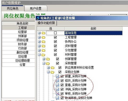 A:模塊授權(quán)判斷,是指用戶針對相關(guān)業(yè)務(wù)單據(jù)所擁有的基礎(chǔ)操作授權(quán),如:業(yè)務(wù)單據(jù)的新建、修改、刪除、查看等。是在系統(tǒng)維護(hù)模塊中【用戶管理權(quán)限設(shè)置】進(jìn)行設(shè)置,只要給先做好【崗位角色】授權(quán),然后給用戶選擇相應(yīng)崗位即可。如下圖: